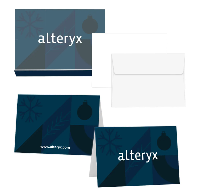 Send a personal holiday greeting using these Alteryx branded notecards complete with envelopes. Set comes with 6 4”x6” notecards + 6 envelopes all packaged in an Alteryx branded box.