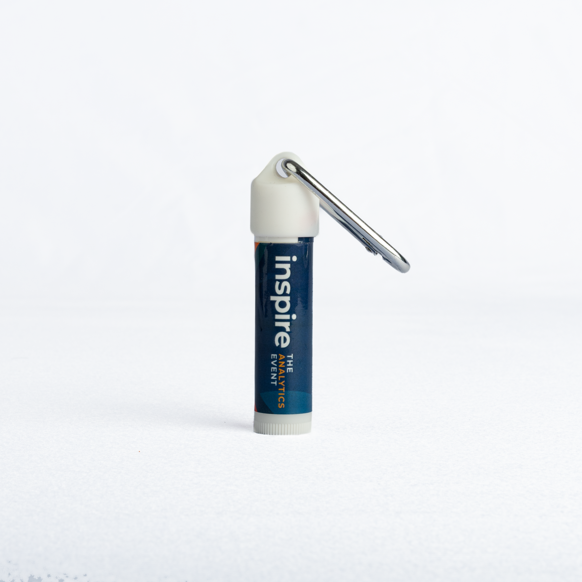 Keep your lips soft on the go! This kit includes a natural beeswax lip balm with Alteryx Inspire-themed branding, a silicone cap, and a carabiner to clip onto your bag or keys. Made in USA of global components