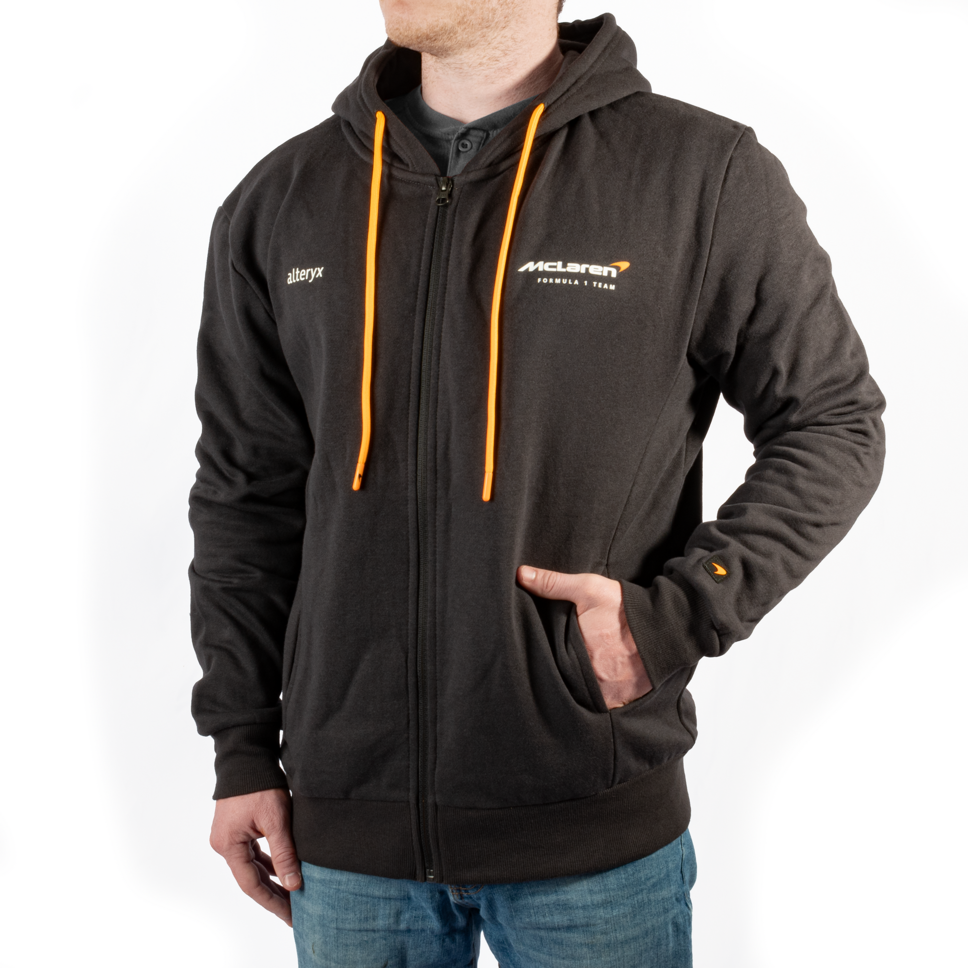 Prepare to hit the races in this Mclaren X Alteryx branded full-zip hoodie.