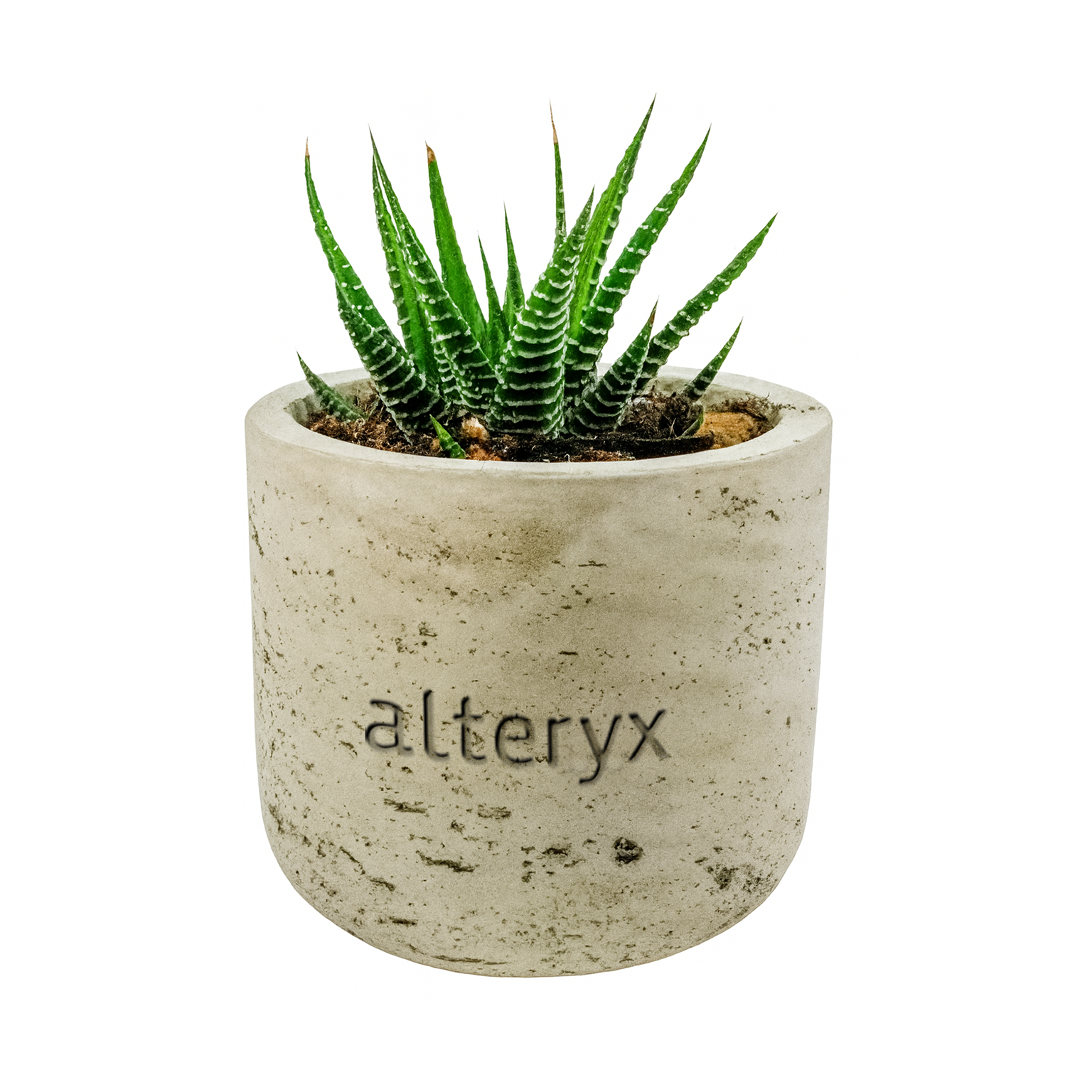 Bring a little life—and Alteryx style—to your workspace. Crafted in Austin from durable concrete with a smooth stone finish, the 3” Pot with a Zebra succulent blends minimalist design with modern sophistication. Each piece is decorated to order, reducing waste through sustainable print-on-demand production. Featuring Alteryx branding, this planter adds a fresh, contemporary touch to your desk or shelf while keeping the company spirit close at hand.