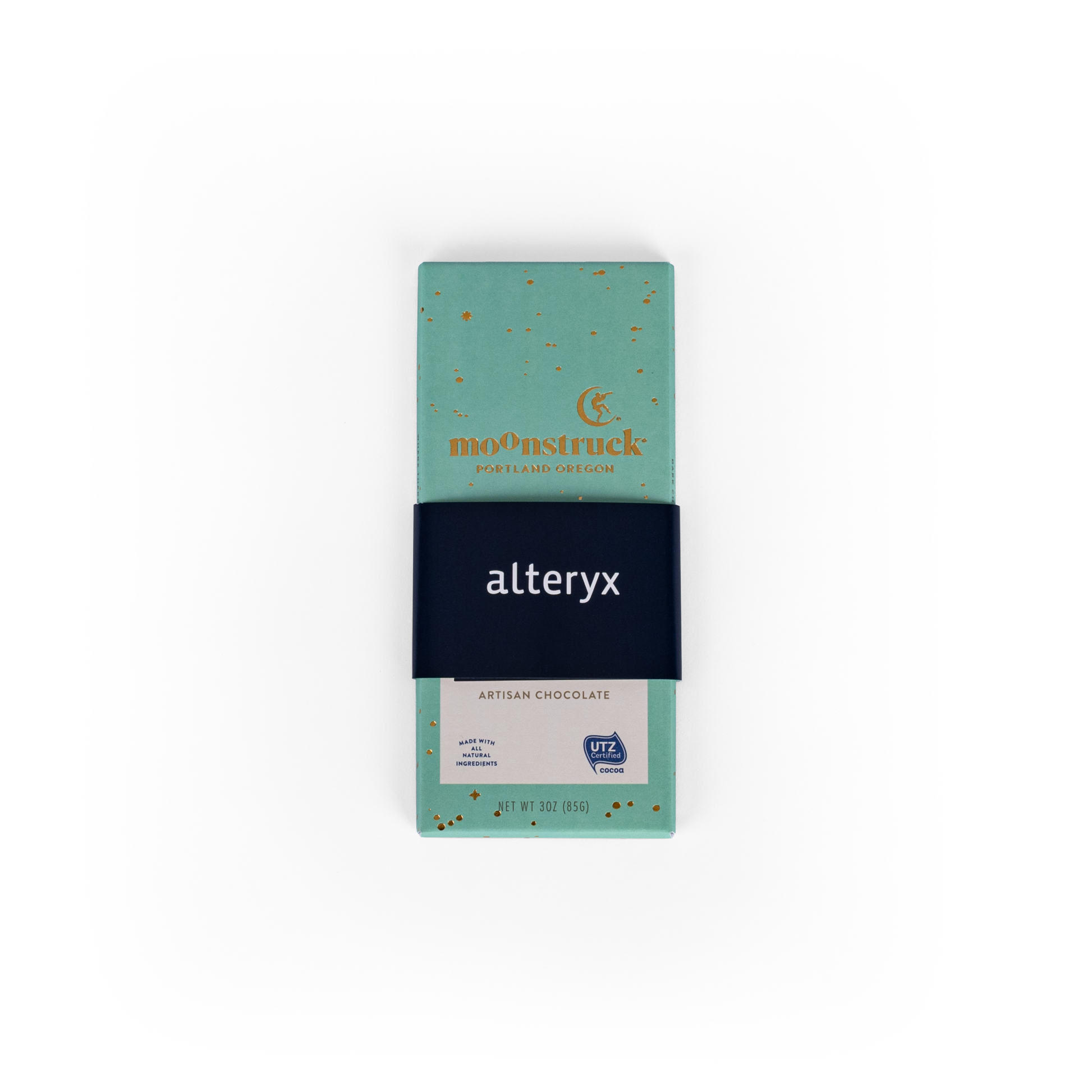 Made by the famous Moonstruck Chocolate factory. Fresh notes of Oregon mint flourish in the dark chocolate depths of this elegant bar, studded with a constellation of cocoa nibs packaged with an Alteryx branded belly band.
