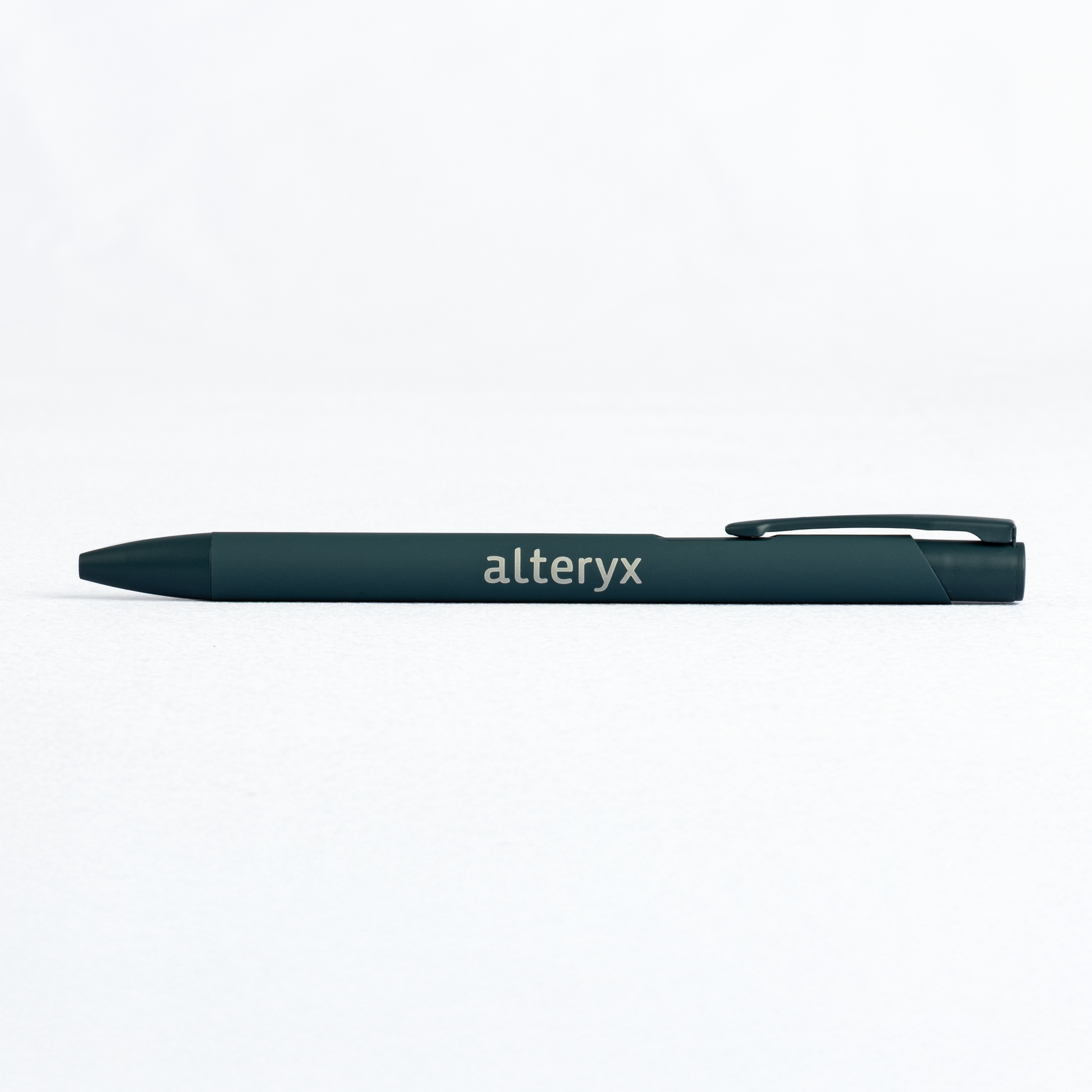 Elevate your writing with the Alteryx-branded aluminum pen. Pen v3 has a satin rubber finish, Alteryx wordmark laser engraved on the barrel and a single black ink cartridge.